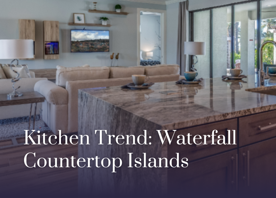 Trending in kitchen remodels are waterfall countertops in kitchen island. This gives your kitchen a focal point of the room as well as very clean lines that are pleasing to the eye.