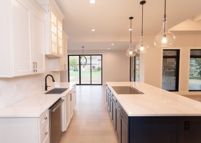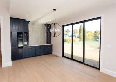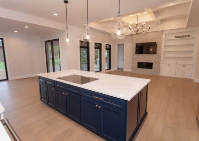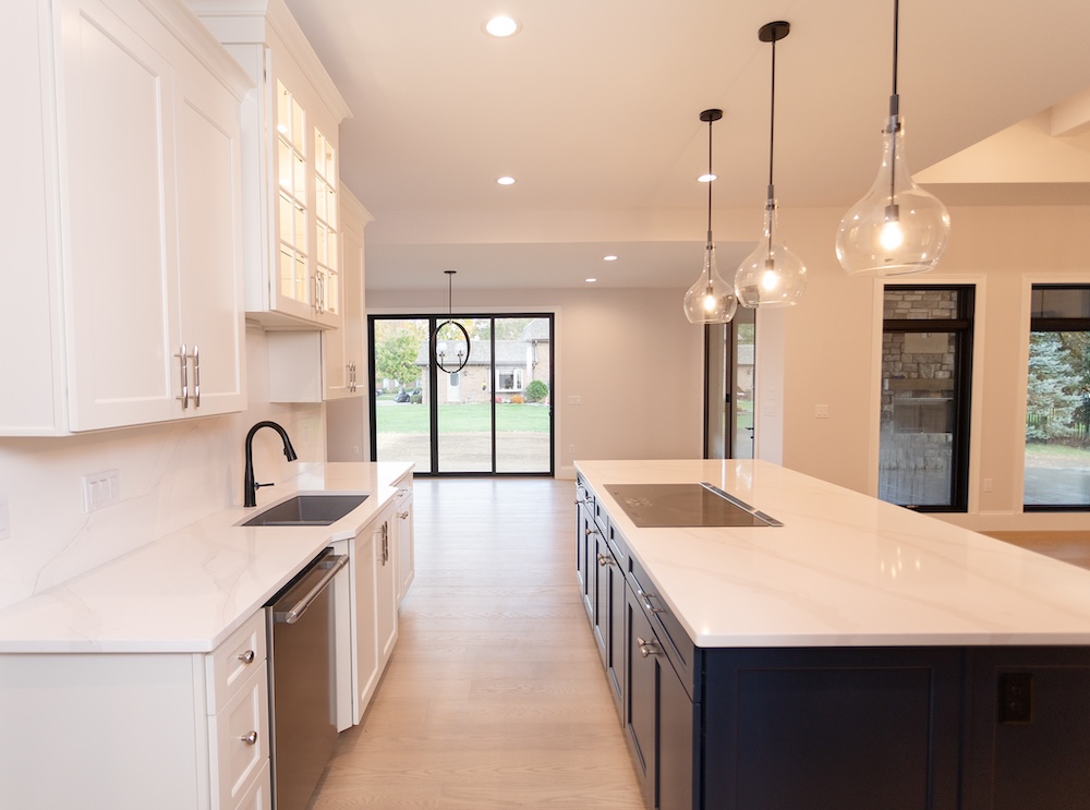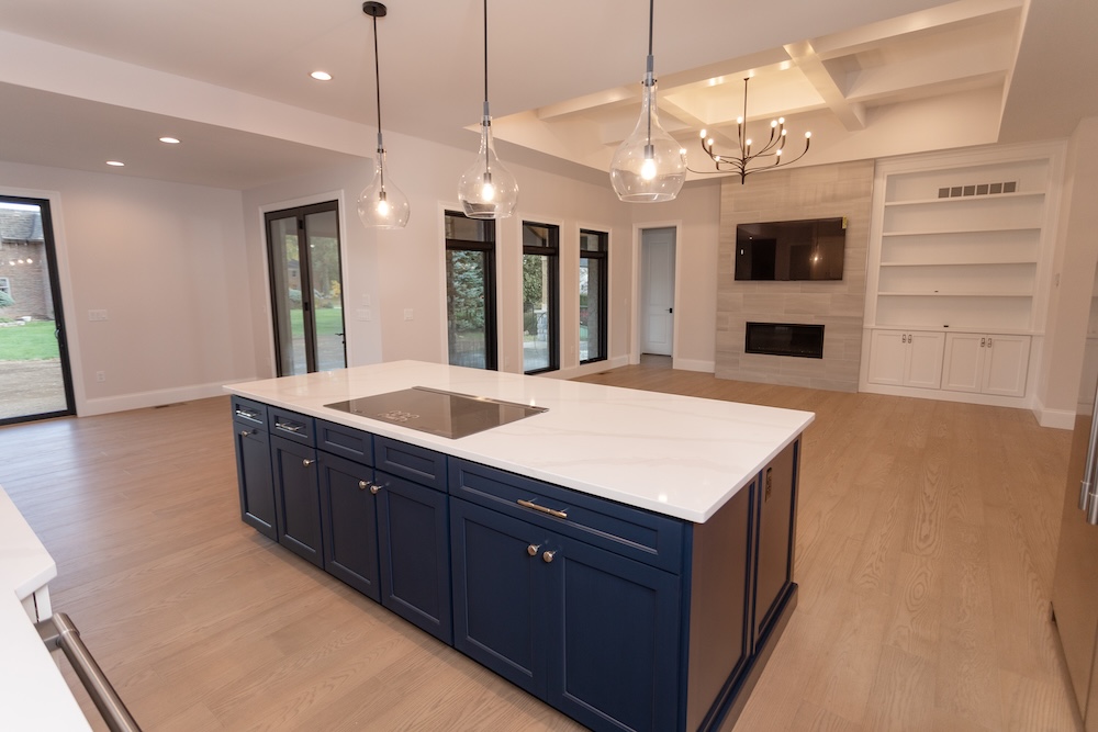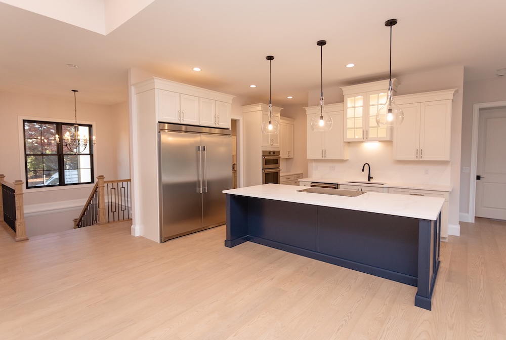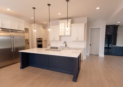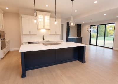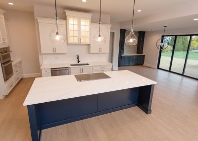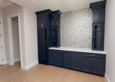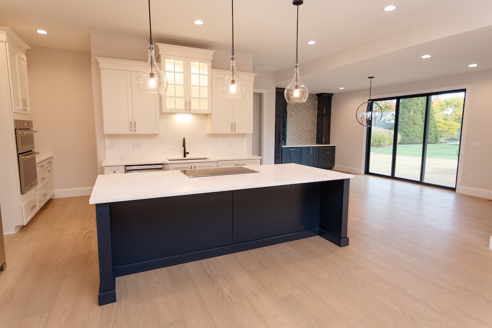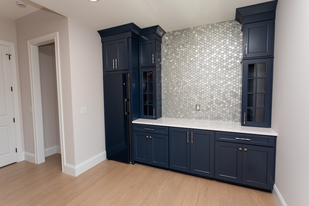 Cabinetry: Door style – Shaker; Perimeter finish – Painted Alabaster; Island/bar finish – Painted Naval with Brushed Grey Glaze