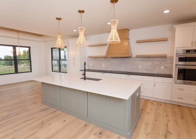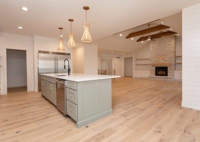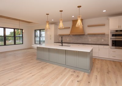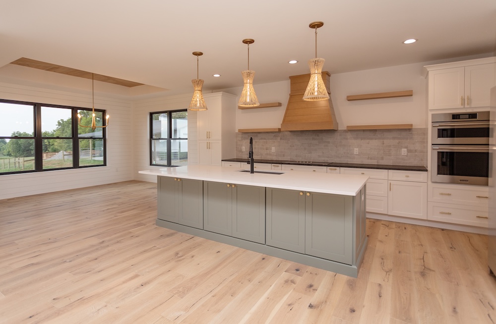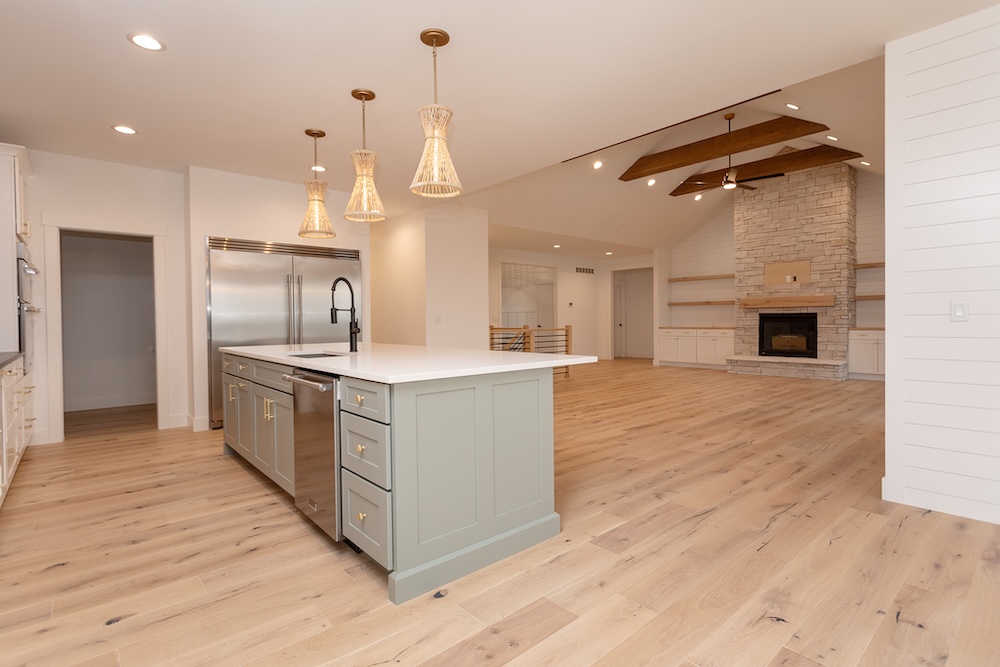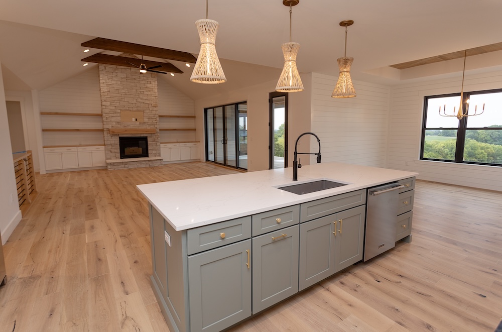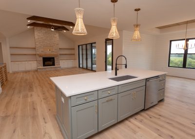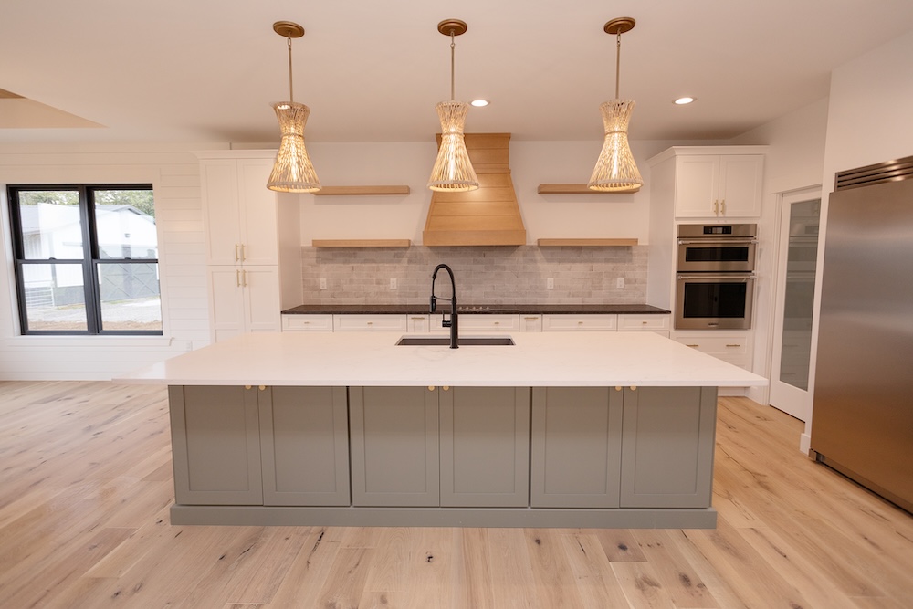 Cabinetry: Perimeter – Fabuwood Galaxy Frost; Island – Sole Cabinetry Jamestown Acacia Haze