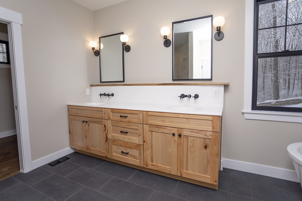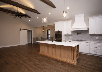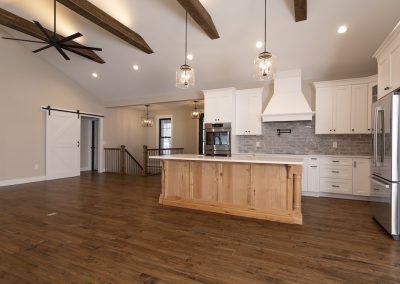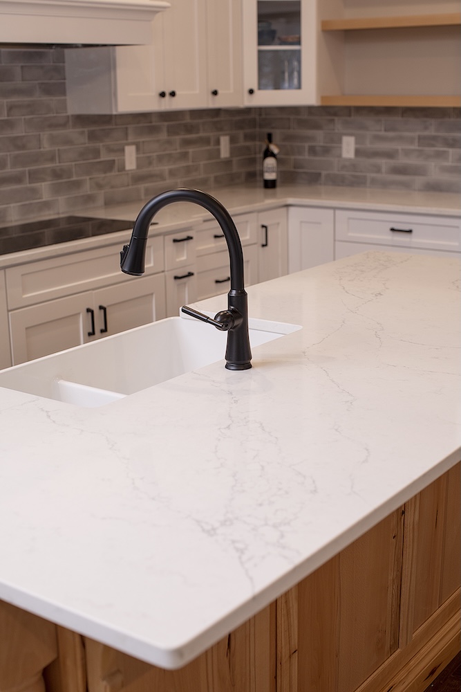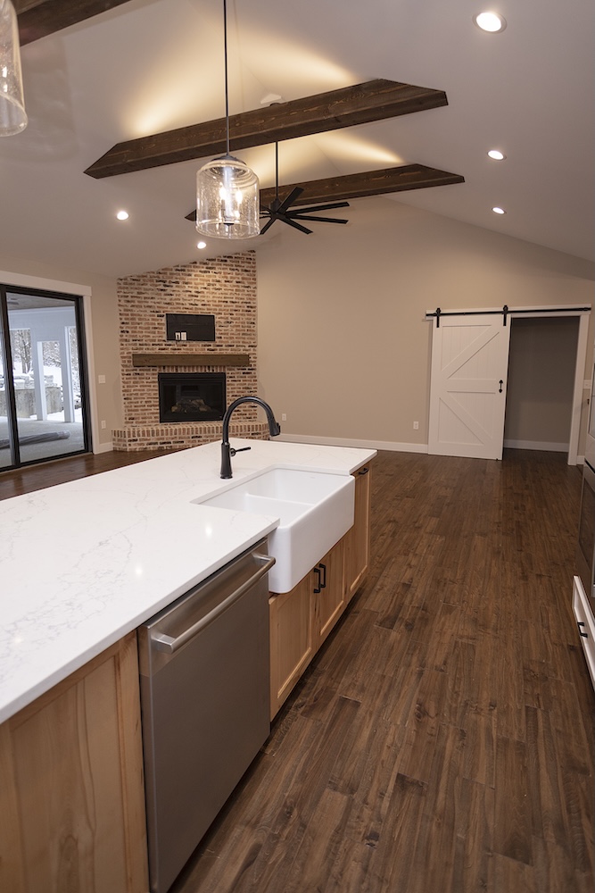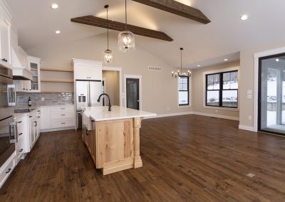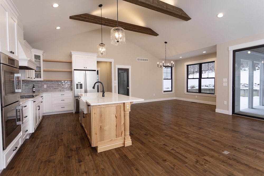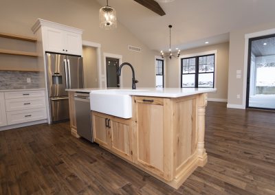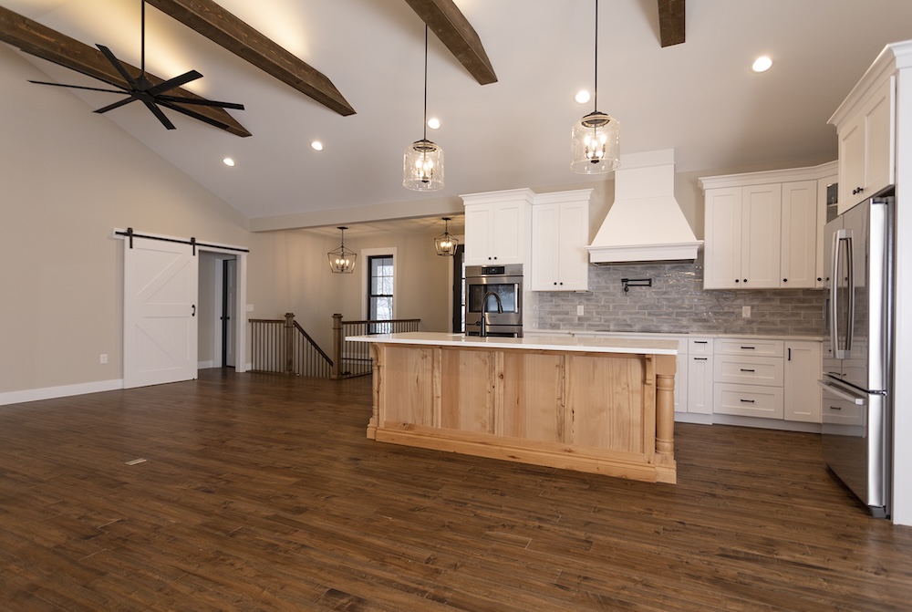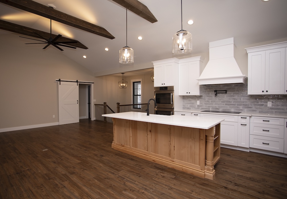 Cabinetry: Perimeter – Fulton Shaker Essentials Series, White Cap; Island – Leawood Natural Rustic Beech; Shevles – Natural Rustic Beech