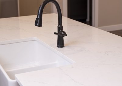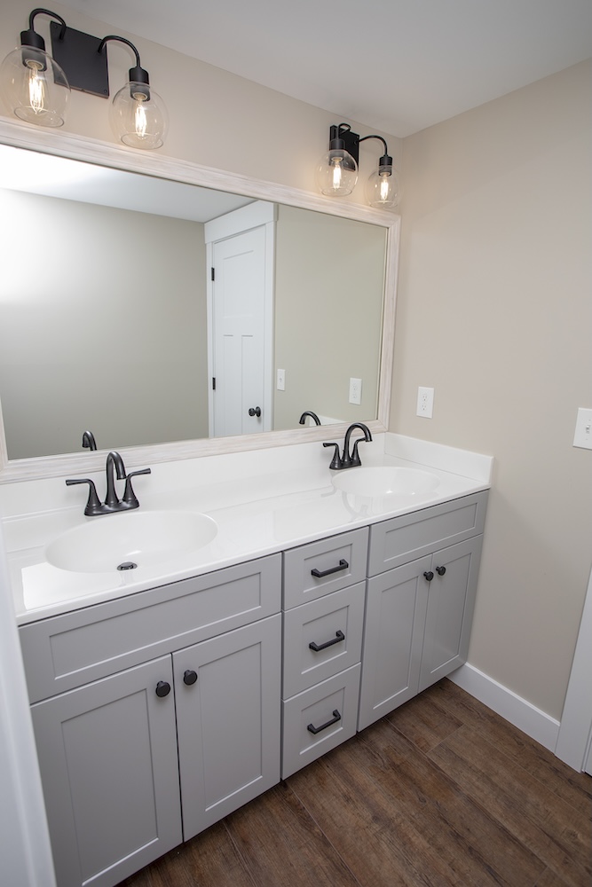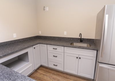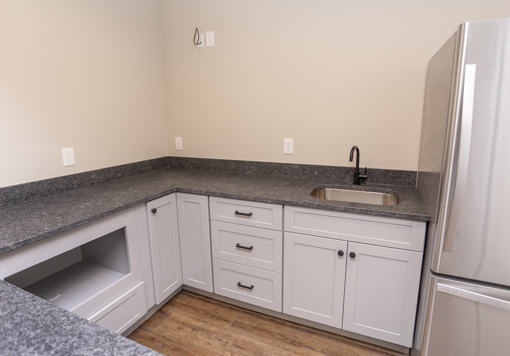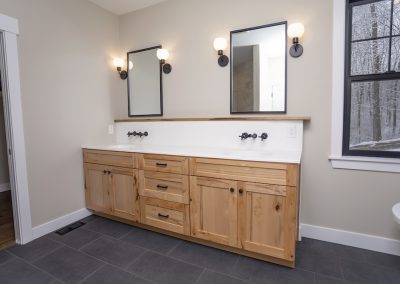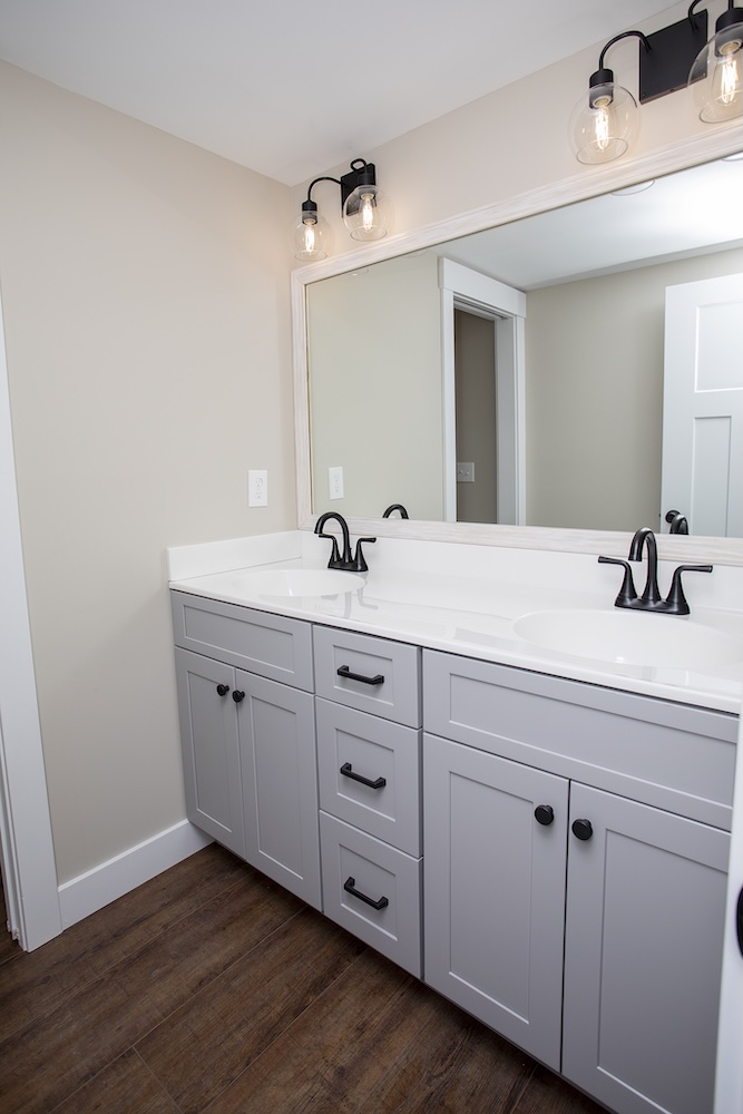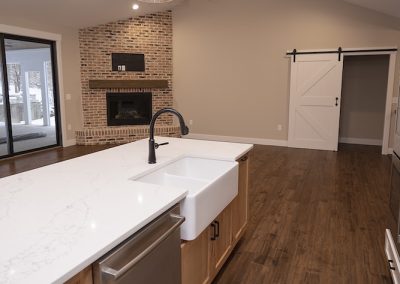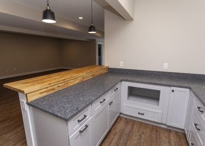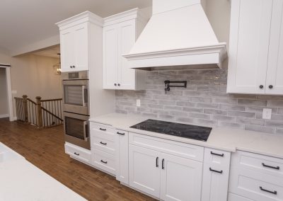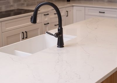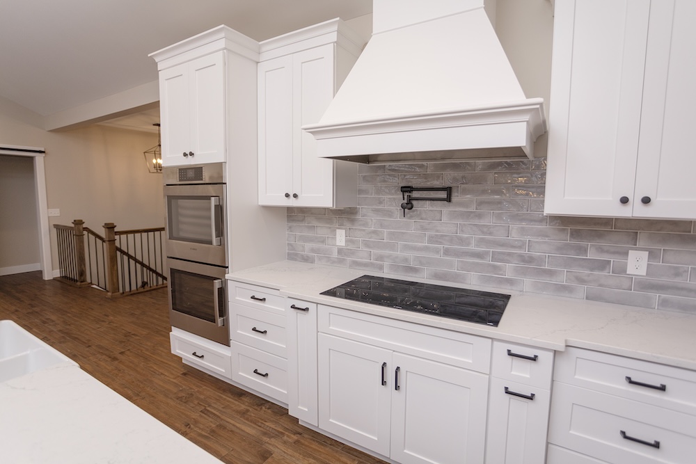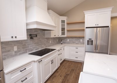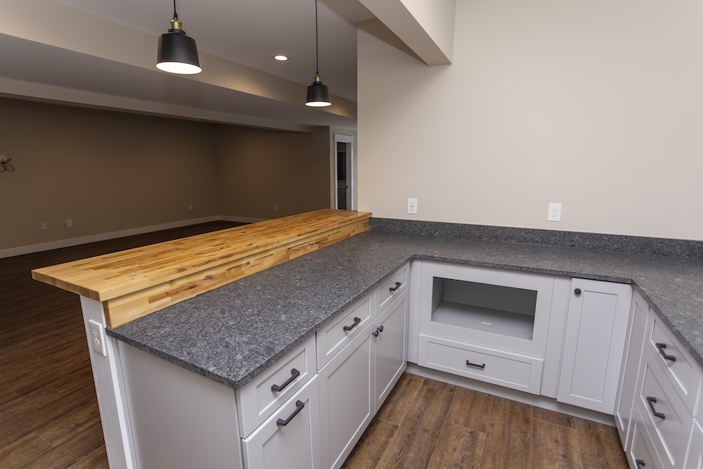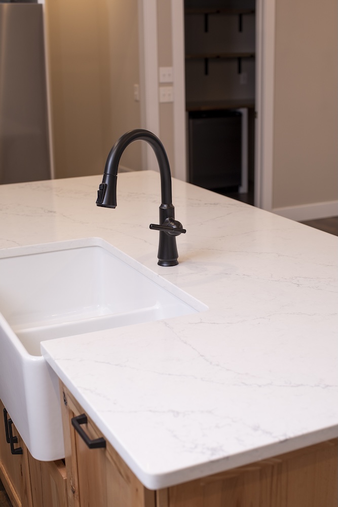 Cabinetry: Perimeter – Fulton Shaker Essentials Series, White Cap; Island – Leawood Natural Rustic Beech; Shevles – Natural Rustic Beech